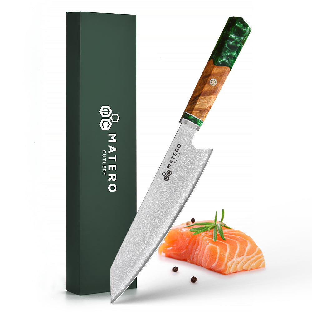 Le Forest Epoxy Damascus Kiritsuke 20 cm de Matero est conçu pour les cuisiniers amateurs qui souhaitent allier précision, caractère et design dans un seul couteau. De la découpe de la viande et du poisson à la hachure fine des légumes et des herbes : ce couteau kiritsuke est un véritable couteau polyvalent qui ne doit pas manquer dans votre cuisine.